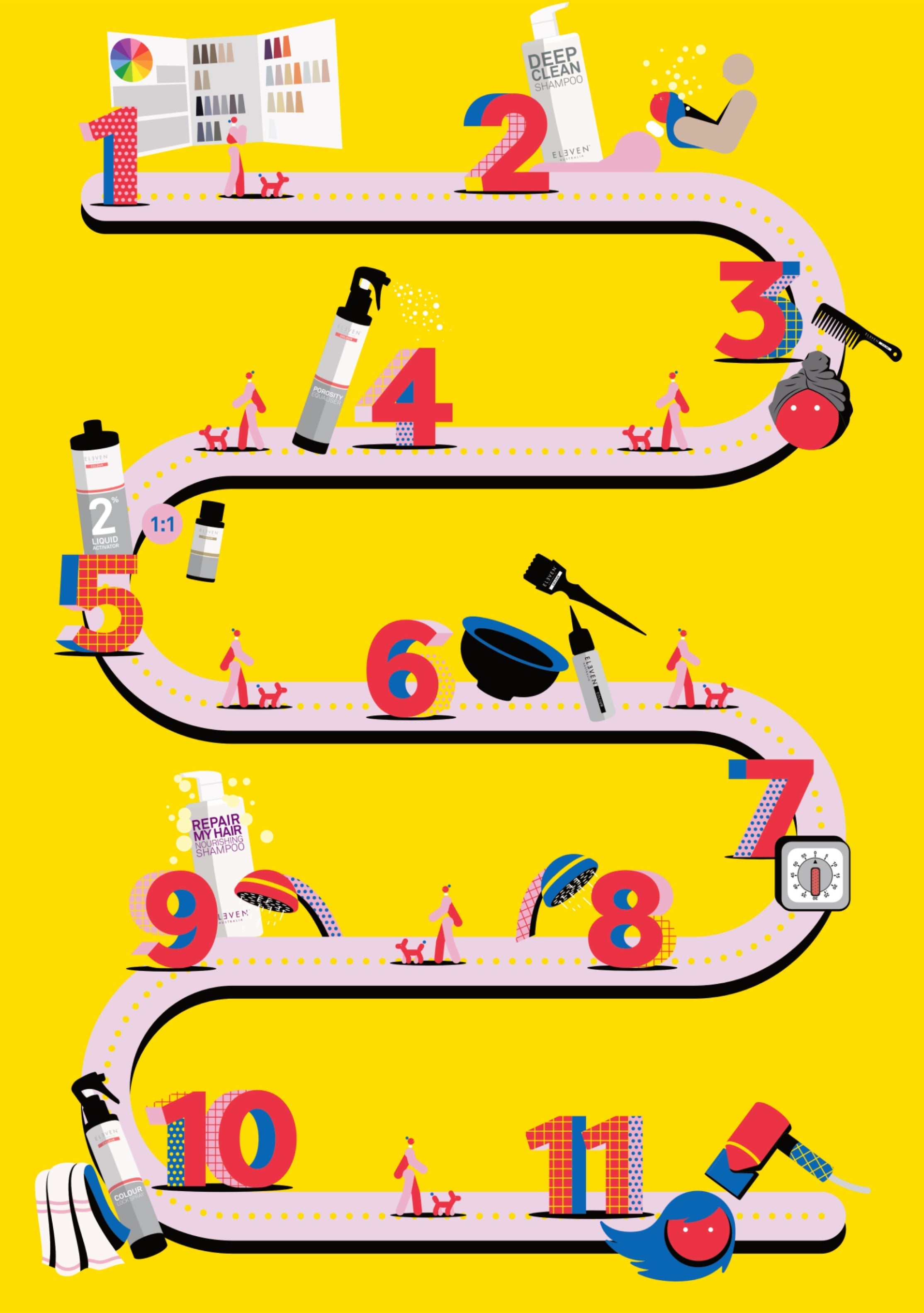 Tørk håret med håndkle. Påfør ELEVEN Australia COLOUR - COLOUR LOCK SPRAY. Ikke skyll ut. Kam håret gjennom med ELEVEN Australia COLOUR Wide Tooth Comb.
