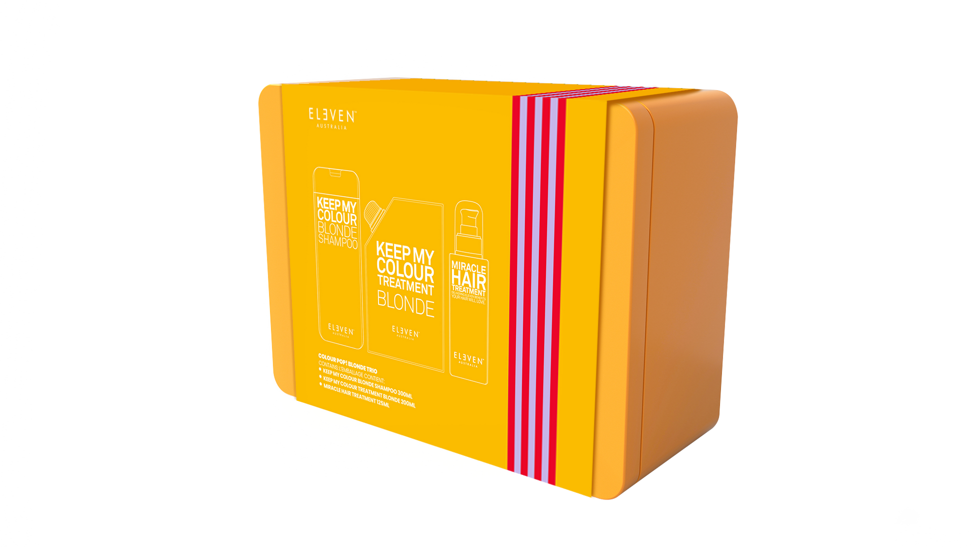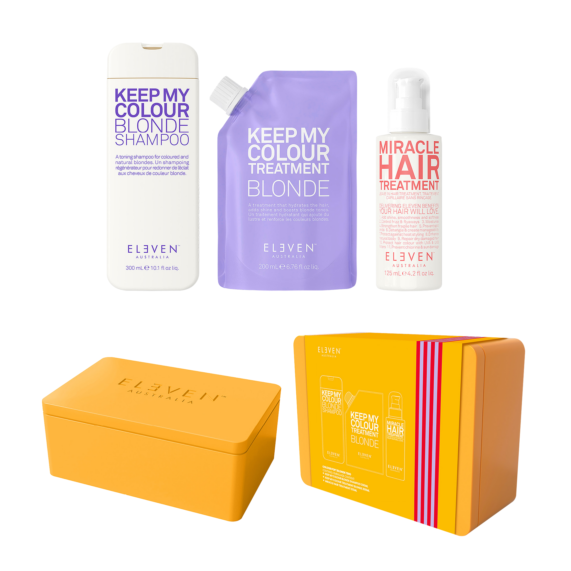 Gi gaven av personlig hårpleie denne sesongen med lanseringen av ELEVEN Australia's Limited Edition Colour Pop HOLIDAY Series. Hold blondfargen din frisk og strålende med vår BLONDE TRIO-pakke! Inkludert er KEEP MY COLOUR BLONDE Shampoo og Treatment, spesialformulert for å bekjempe gulskjær og gi håret volum og glans. Shampooen bruker en blå base for å nøytralisere brassiness, mens Treatment gir ekstra glans og pleie med Macadamia mutterolje. Denne pakken kommer i en eksklusiv Limited Edition alluminiumboks!